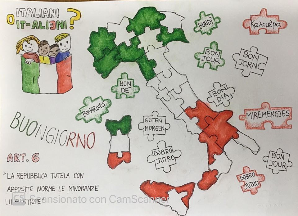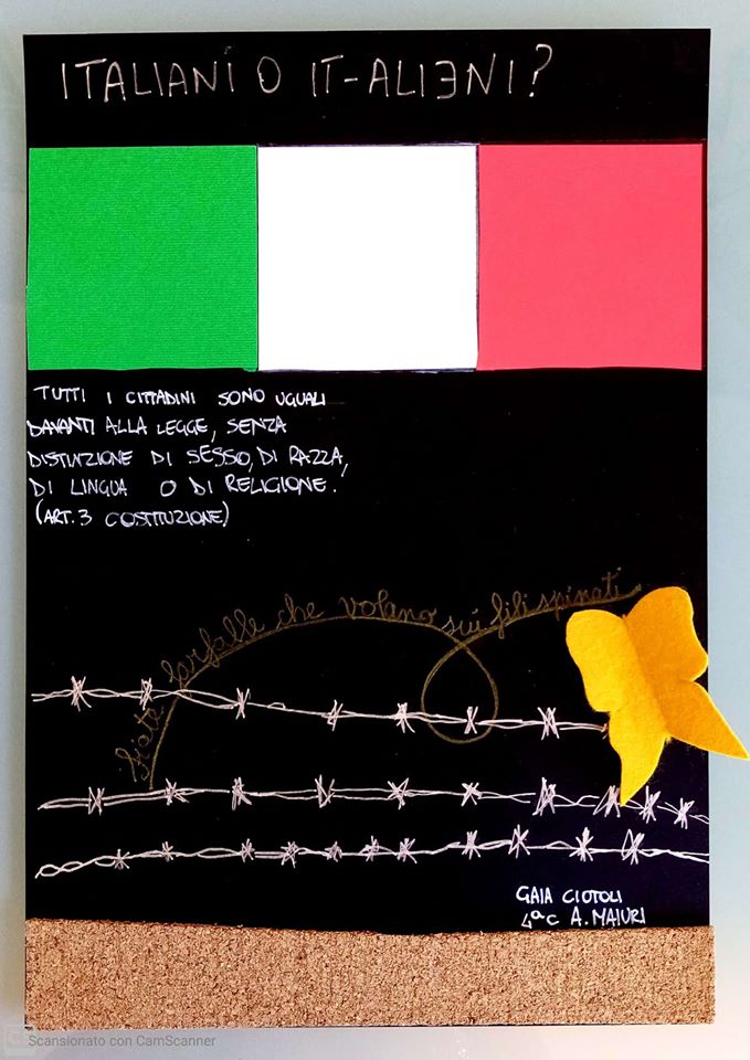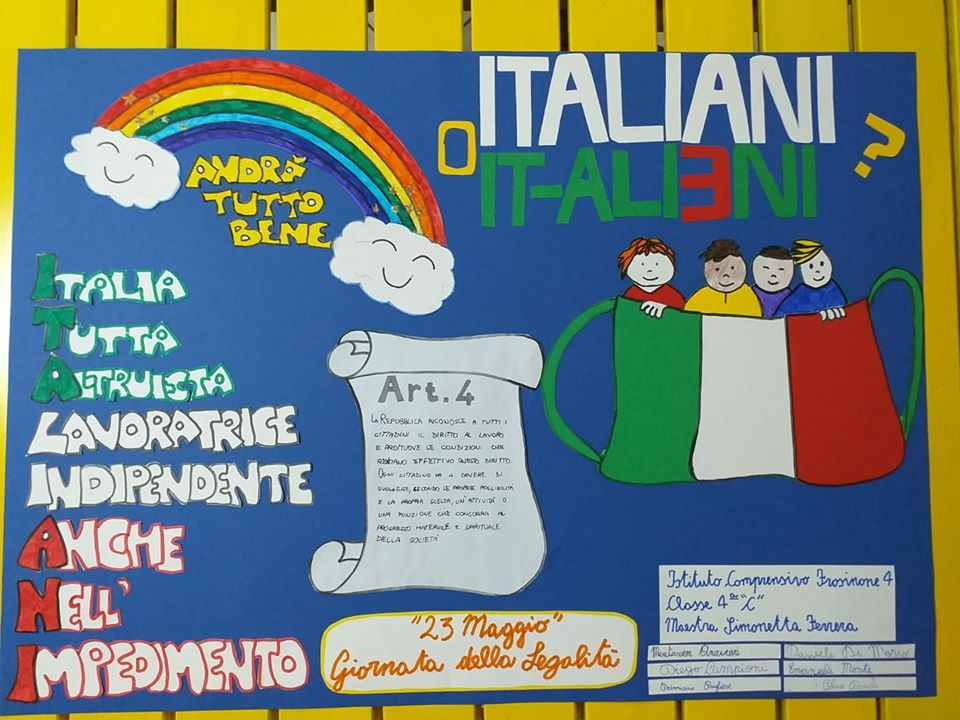 Questi disegni sono la prova di come “Italiani o it-alieni?” possa motivare ed ispirare la didattica, la creatività di classe, la bellezza e la voglia di fare ed essere scuola. Siamo lieti di condividere i bellissimi lavori realizzati dalla classe 4a C (ora 5) della Primaria “Maiuri”, dell’IC Frosinone 4, diretto a Frosinone dal prof. Giovanni Guglielmi. L’impegno didattico è stato coordinato dalla docente Simonetta Ferrera. Le pagine del libro  hanno suggerito agli allievi di Frosinone riflessioni, studi e ricerche ad ampio raggio, tutte concentrate sui temi della cittadinanza attiva e dei 12 Principi fondamentali della Costituzione, filo conduttore del libro.