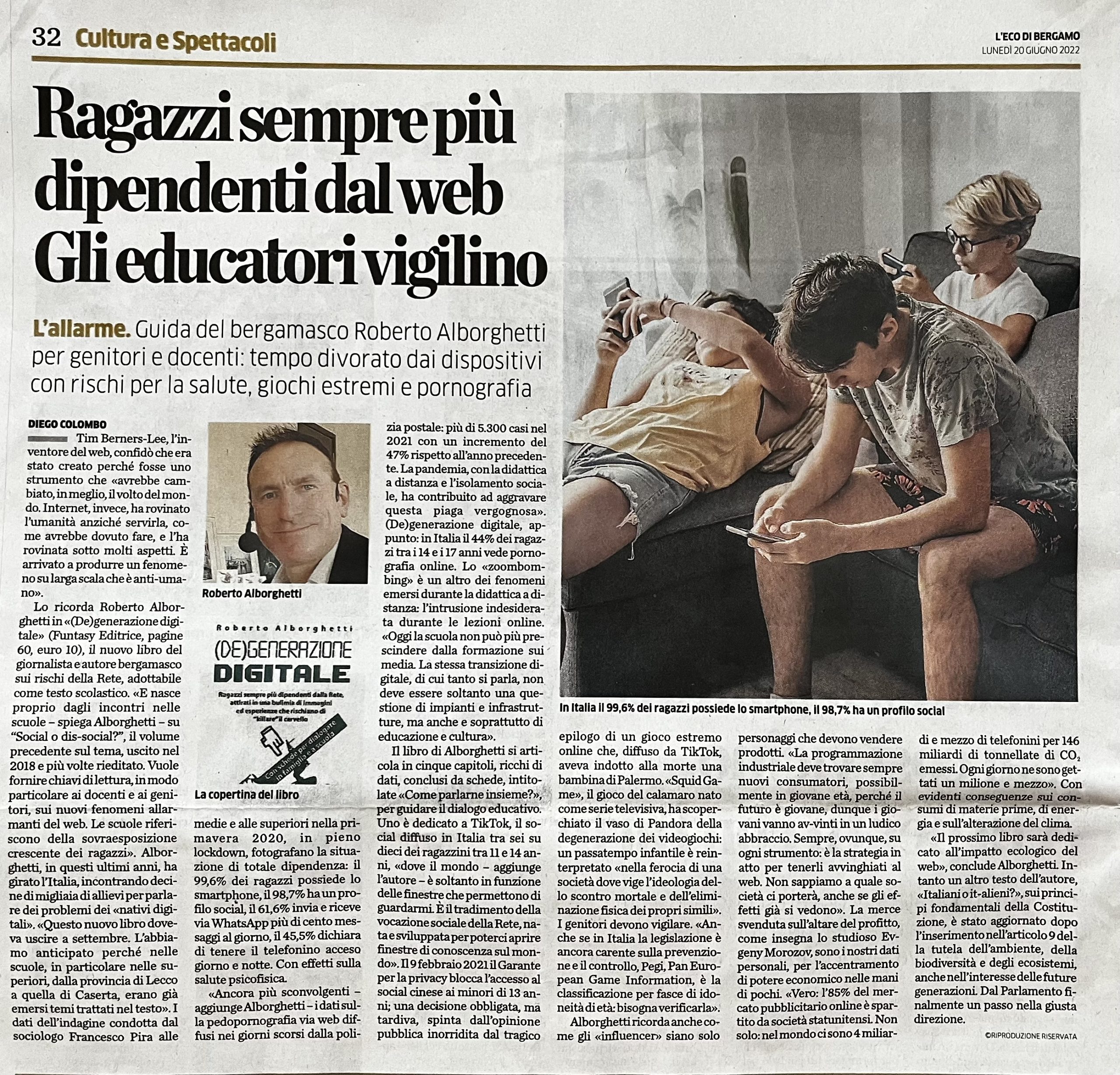 Il quotidiano “L’Eco di Bergamo” dedica ampio spazio ed attenzione alla presentazione del libro di Roberto Alborghetti, “(De)generazione digitale”, grande novità…