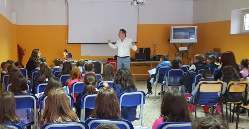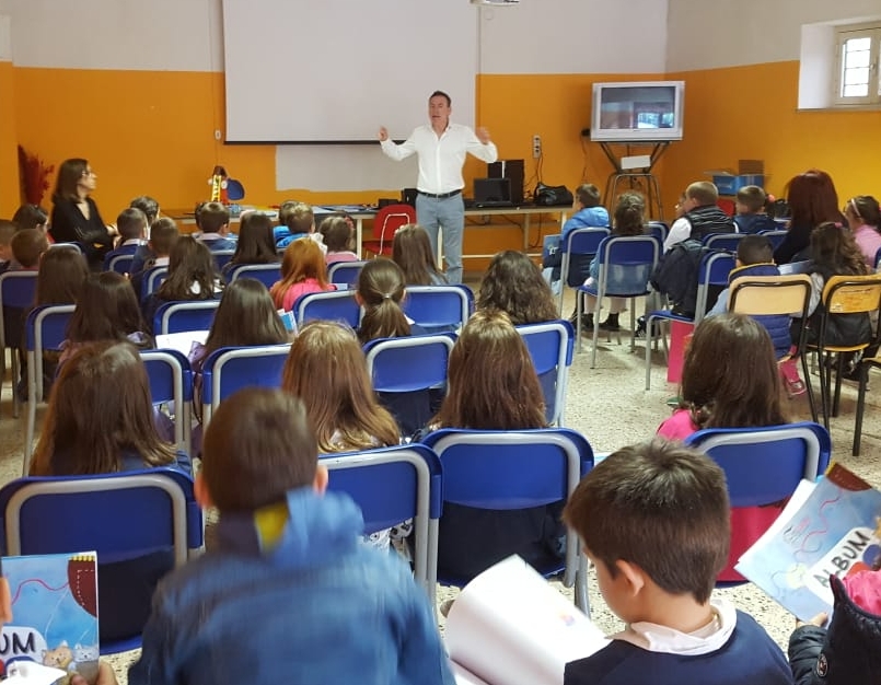 Plastici, tabelloni, disegni, album e chi più ne ha più ne metta. Anche nei plessi delle Scuole dell’Infanzia e delle Classi Prime della Primaria dell’Istituto Comprensivo Veroli 2, a Veroli, (FR) l’AlbumOne di Funtasy ha conquistato tutti: bimbe, bimbi, docenti e genitori. Le “avventure in mongolfiera” dei micetti Jimmy e Danny – la prima delle otto storie di AlbumOne – erano state adottate nei mesi scorsi dall’IC Veroli 2, con sede a Giglio, per il Progetto Continuità (Infanzia-Primaria). Poi, a metà maggio, ecco la verifica e la condivisione del lavoro svolto con l’intervento di Roberto Alborghetti, autore, e di Paolo Sandini, coordinatore del progetto di Funtasy, le “Edizioni del Divertimente”.
