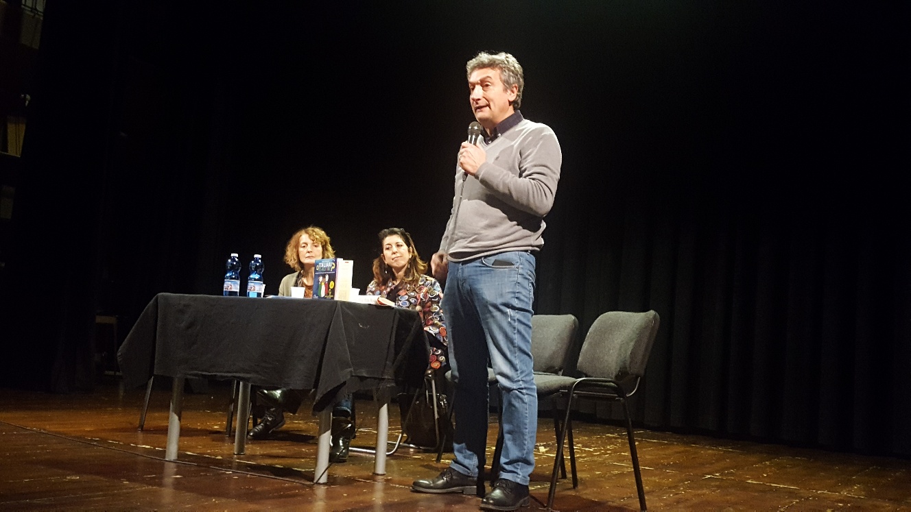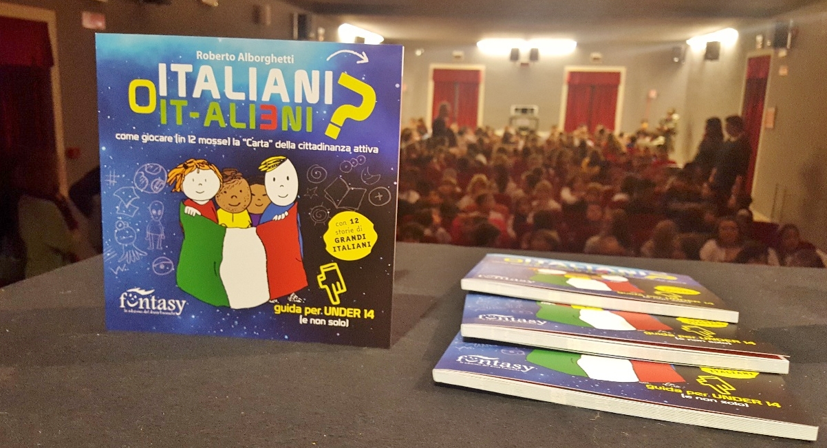 Si può parlare di… diritti costituzionali a bambine e bambini di 8, 9, 10 anni? Si può. Anzi, si deve. Ieri a Bucine (AR) grande accoglienza per il libro “Italiani o It-alieni? /Come giocare (in 12 mosse) la “carta” della cittadinanza attiva” (Funtasy editrice). Il testo, scritto da Roberto Alborghetti e illustrato da Eleonora Moretti, è stato proposto nell’ambito dell’annuale Mostra Mercato del Libro, in corso presso il salone dell’Istituto Comprensivo che insieme al Comune ha promosso la manifestazione. E’ stata la Dirigente dell’IC prof.ssa Lisa Sacchetti ad aprire l’incontro, al quale ha portato il saluto Paola Coppi in rappresentanza del Consiglio Comunale e del Sindaco. Il Teatro Comunale era strapieno di alunni e alunne, dalla terza primaria alle classi della prima secondaria di primo grado. Circa 250 allievi che hanno seguito con grande attenzione ed interesse, dimostrando l’importanza di essere “Italiani” e non “It-alieni”.