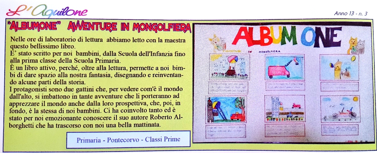 Ma che bella sorpresa vedere l’AlbumOne citato e presentato sulle pagine de L’Aquilone, il pluripremiato giornale scolastico dell’Istituto Comprensivo Pontecorvo 2 di Pontecorvo (FR)! Infatti, il primo fascicolo della popolare collana di Funtasy dedicata alla scuole dell’infanzia e primaria (prime due classi) è illustrato con grande attenzione, raccontando anche la bella riuscita dell’incontro di Roberto Alborghetti, autore di AlbumOne, con i piccoli allievi ed allieve della Scuola dell’infanzia e della Scuola Primaria “P.Sarro” dell’IC Pontecorvo 2 diretto dalla dott.ssa Rita Cavallo.
