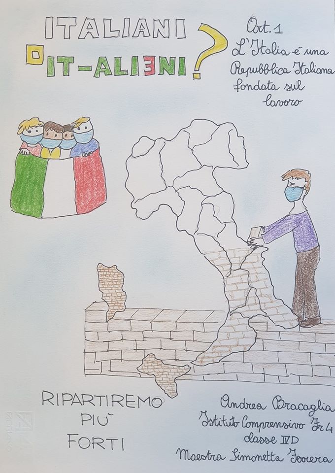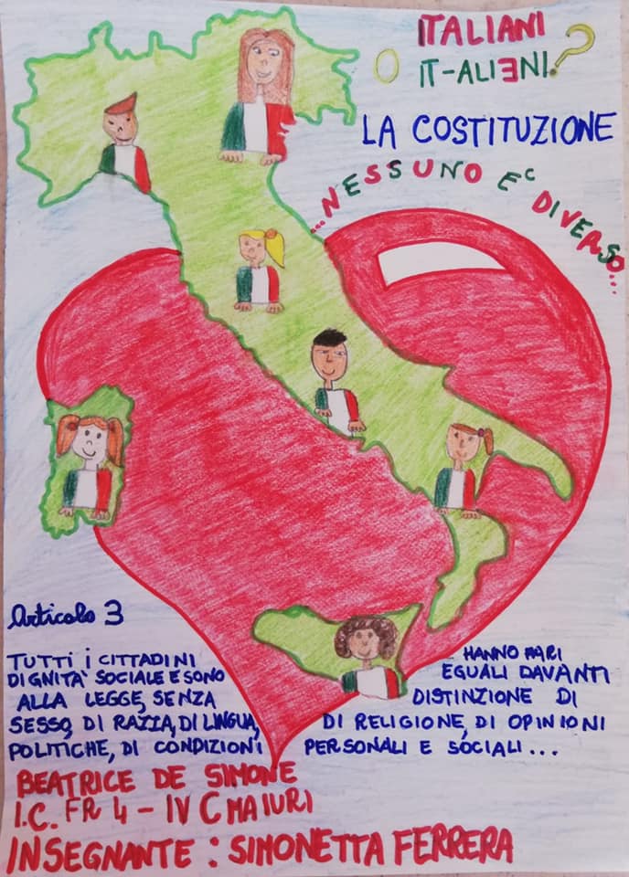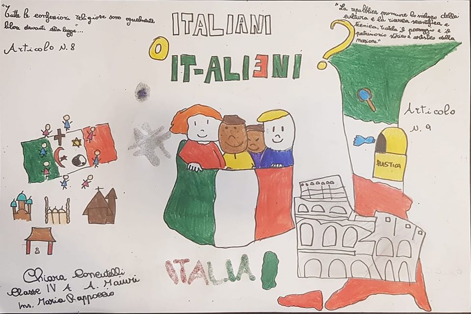 Davvero bravissimi gli alunni della “Maiuri” che, guidati dalla docente Simonetta Ferrera hanno realizzato i bellissimi elaborati ispirati ai capitoli di  “Italiani o it-alieni?”. Tutto ciò che è stato messo a punto – riflessioni, disegni, lavori vari – ci porta ancora una volta ad affermare quanto siano determinanti, oggi più che mai, la scuola e l’istruzione per la civiltà di un Popolo e di una Nazione. Grazie di cuore alle alunne e agli alunni, alla maestra, Simonetta, alla vostra scuola e al Dirigente prof. Giovanni Guglielmi“.