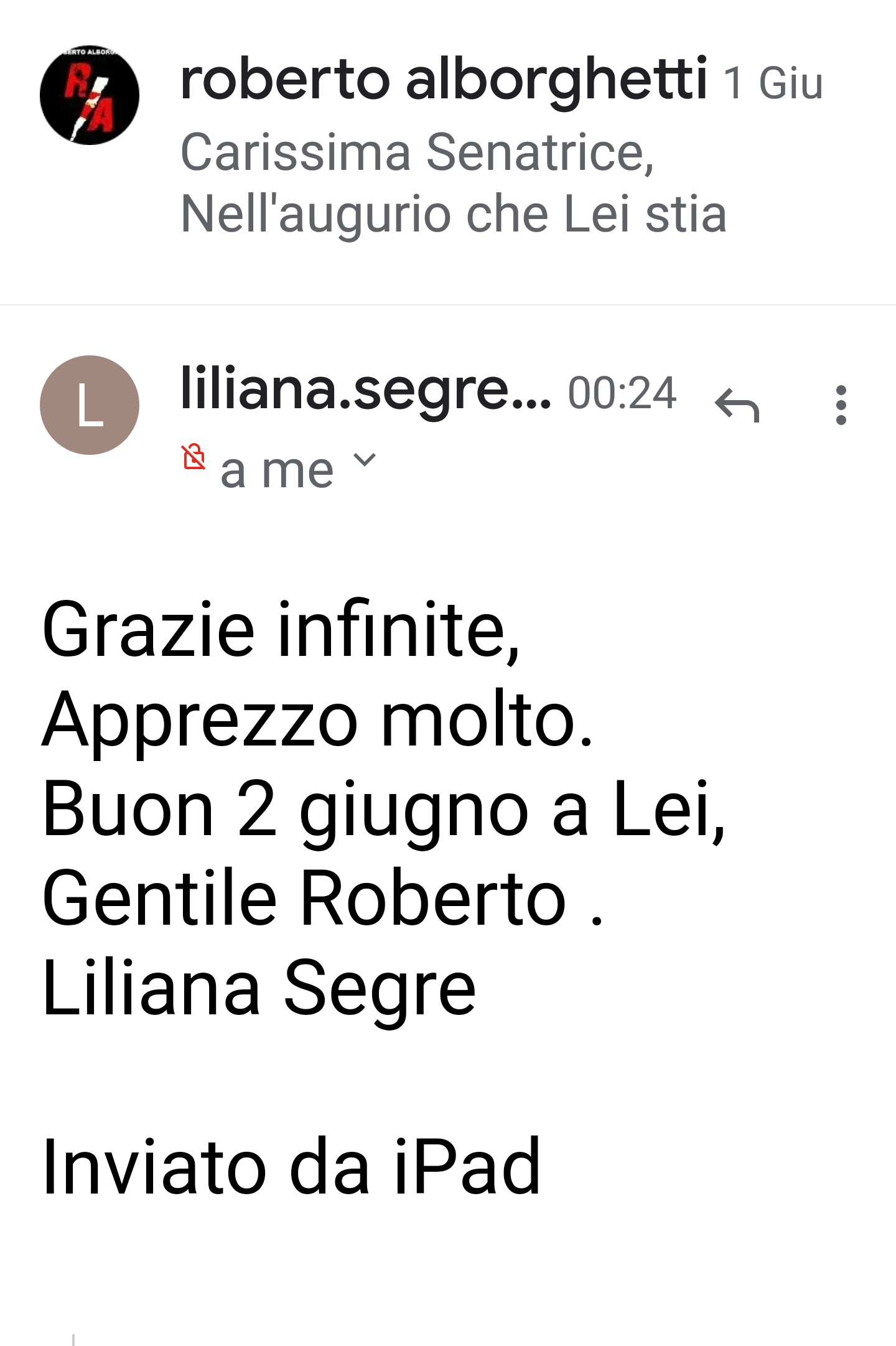 Una delle 12 grandi storie che ho scritto nel libro “Italiani o It-alieni?” (Illustrazioni di Eleonora Moretti, Funtasy Editrice) parla di Liliana Segre. Ieri avevo inviato alla Senatrice il lavoro che la Classe 4a C della Scuola Primaria “Maiuri”, IC Frosinone 4DS Giovanni Guglielmi, docente coordinatrice Simonetta Ferrera – aveva svolto sul libro sui temi della cittadinanza attiva e della Costituzione; ne abbiamo parlato qualche giorno fa anche su questo Blog. Stamane trovo nella posta la risposta di Liliana Segre. Un piccolo grande gesto che conferma la sensibilità di una donna straordinaria, sopravvissuta agli orrori per raccontare storie e speranze di libertà, civiltà e democrazia. Buona Festa della Repubblica!