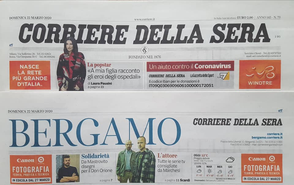 Su Il Corriere della Sera del 22 marzo, edizione Bergamo, é pubblicato un bellissimo articolo di Matteo Castellucci sulla straordinaria iniziativa che sta coinvolgendo scuole di tutta Italia, con AlbumOne di Funtasy Editrice e la storia a puntate “Il giorno in cui Cattivirus finì ko”. Nell’articolo, Roberto Alborghetti è intervistato sul senso e sulle modalità di un’attività partecipata da allievi, docenti e famiglie. Un grazie a Matteo e al suo direttore Riccardo Nisoli per l’attenzione e la sensibilità nei riguardi di questa esperienza. In foto: il titolo e le testate del Corsera.