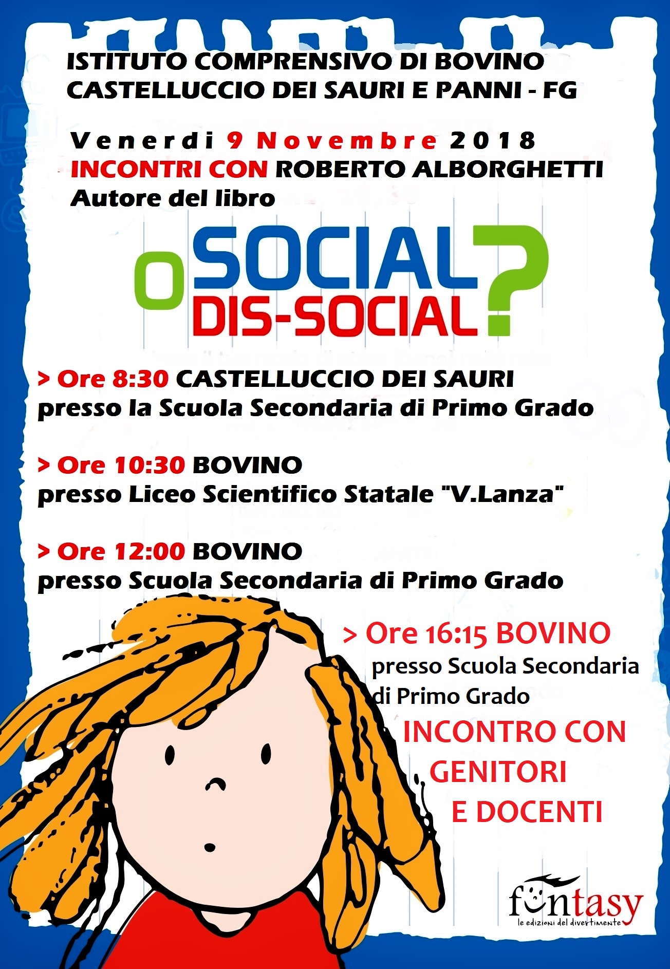 A Frosinone, con l’Istituto Comprensivo 4°, diretto dal prof. Giovanni Guglielmi, si terrà martedì 6 novembre 2018, la “prima” nazionale del libro “Social o dis-social?”, la coinvolgente e innovativa guida scritta da Roberto Alborghetti per accompagnare gli “under 14″(e non solo) nella navigazione web, edita da Funtasy. Illustrato graficamente da Eleonora Moretti e stampato con il carattere ad alta leggibilità Easy Reading, il testo presenta quello che occorre sapere per vivere la tecnologia come una grande opportunità e non come un’esperienza che può ostacolare il ben-essere personale.