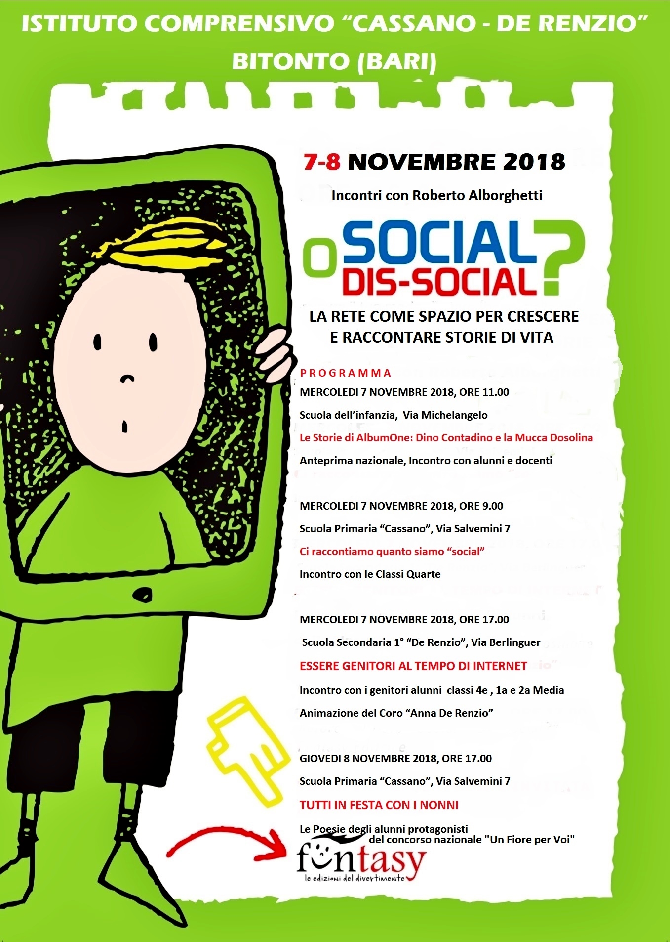 “Social o dis-social? / La Rete come uno spazio per crescere e creare storie di vita” è il titolo di una due-giorni che si terrà il 7 e l’8 novembre 2018 a Bitonto (Bari) presso l’Istituto Comprensivo “Cassano-De Renzio”, diretto dalla dott.ssa Anna Bellezza. Gli incontri coinvolgeranno le classi della scuola dell’infanzia, della scuola primaria e della scuola secondaria di 1° e saranno condotti da Roberto Alborghetti, giornalista e autore di “Social o dis-social / Misura il tuo modo di stare (bene) nella Rete” e di “AlbumOne”, editi da Funtasy, di fresca pubblicazione. Le tematiche dell’uso consapevole della Rete e come la Rete possa diventare uno spazio di espressione e creatività saranno al centro delle attività, che coinvolgeranno anche i genitori. Ecco, nei particolari, come si svolgerà il programma delle due giornate.